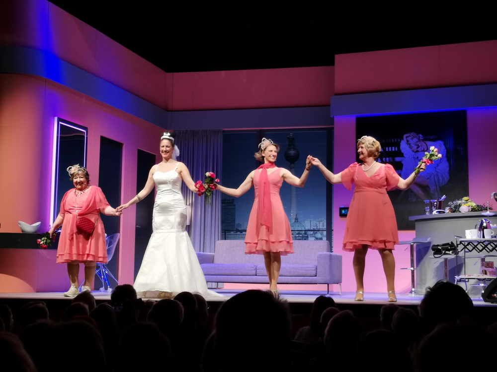 She’s got a Hangover! Wenige Stunden vor ihrer Hochzeit erwacht „Karrierefrau“ (gespielt von Charlotte Heinke) in ihrer Hotel-Suite… schwerverkatert und nur mit wenigen Erinnerungen an letzte Nacht. Wenig später geht die turbulente Geschichte dann so richtig los. Hausfrau (Angelika Mann), die Vornehme (Heike Jonca) und die Junge (Nini Stadlmann), die sie zur Hochzeit einlud, stoßen dazu. Ziemlich zu Beginn gibt’s dabei direkt eine der genialen musikalischen Nummern: „Hausfrau“, interessierte Klatschblatt-Leserin, stellt fest, dass Tür an Tür mit ihnen Schlagerstar Howard Carpendale wohnt. Das leitet die eigens für das Stück umgeschriebene, urkomische Version vom Smokie-Hit „Alice“ ein, der bekanntlich auch sehr erfolgreich von Carpendale einst auf Deutsch erschien.
